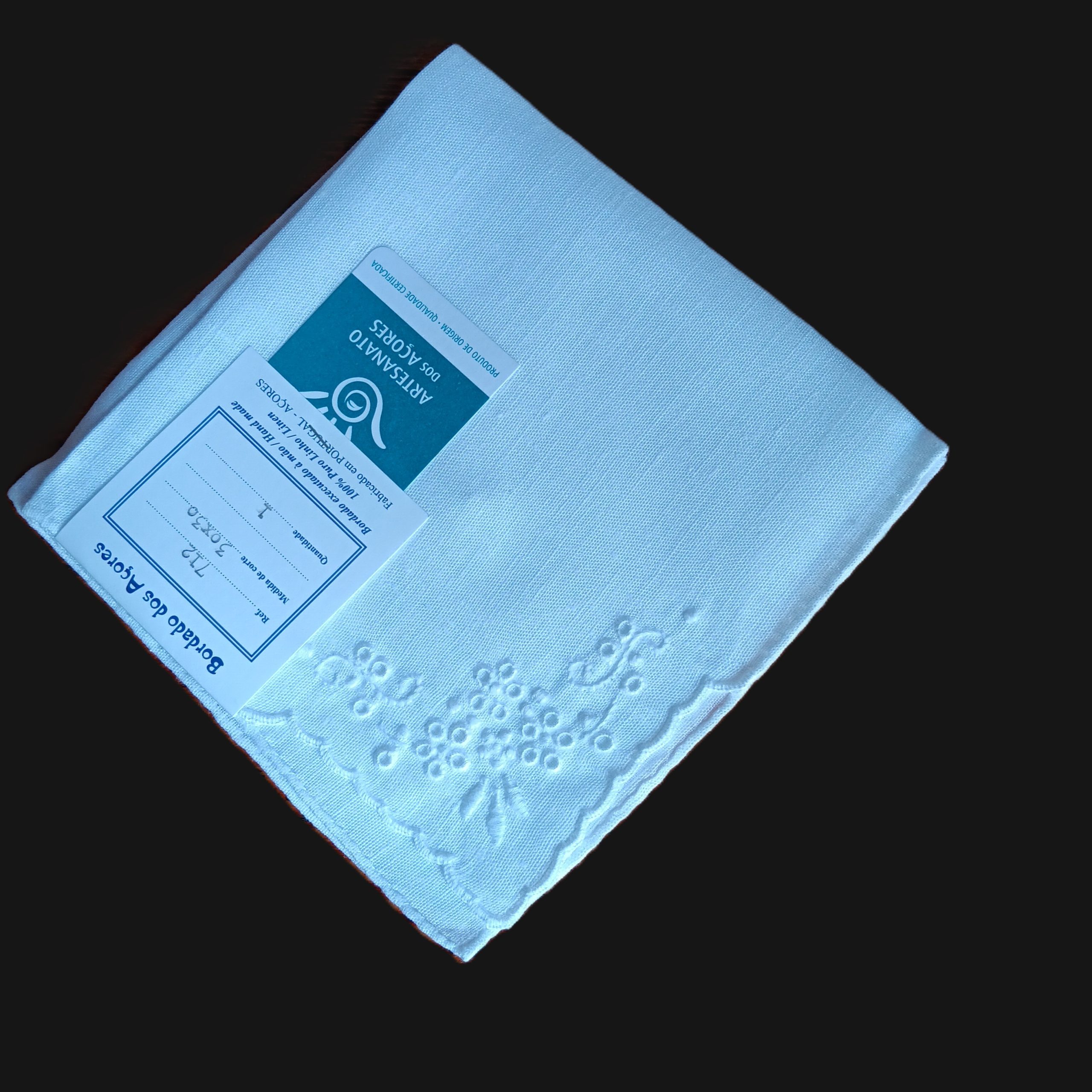 Apontamento bordado a Ilhoses, em linho branco