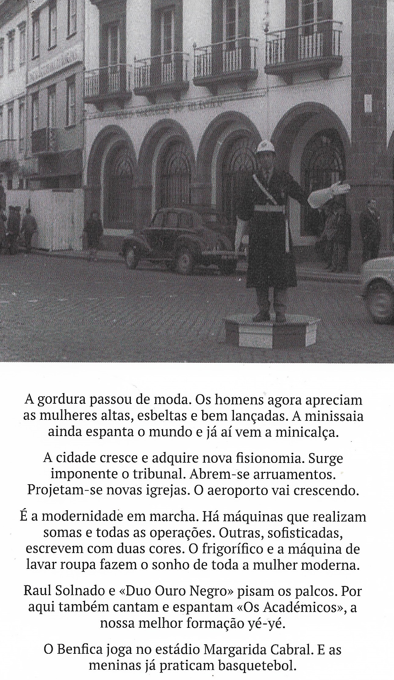 Capa mole = 23*17cm Páginas = 239 Peso = 392gr A gordura passou de moda. Os homens agora apreciam as mulheres altas, esbeltas e bem lançadas. A minissaia ainda espanta o mundo e já ai vem a minicalça. A cidade cresce e adquire nova fisionomia. Surge imponente o tribunal. Abrem-se arruamentos. Projetam-se novas igrejas. O aeroporto vais crescendo. É a modernidade em marcha. Há máquinas que realizam somas e todas as operações. Outras, sofisticadas, escrevem com duas cores. O frigorifico e a máquina de lavar roupa fazem o sonho de toda a mulher moderna. Raul Solnado e «Duo Ouro Negro» pisam os palcos. Por aqui também cantam e espantam «Os Académicos», a nossa melhor formação yé-yé. O benfica joga no estádio Margarida Cabral. E as meninas já praticam basquetebol.